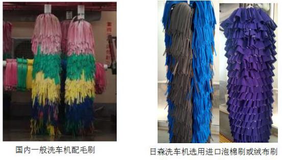 ????日森全自動(dòng)洗車機(jī)在刷子材質(zhì)上一直選用進(jìn)口泡棉材質(zhì),抗老化能力強(qiáng),洗10萬(wàn)輛車還能保證質(zhì)地柔軟。絨布刷為進(jìn)口高織棉,洗凈度更高。